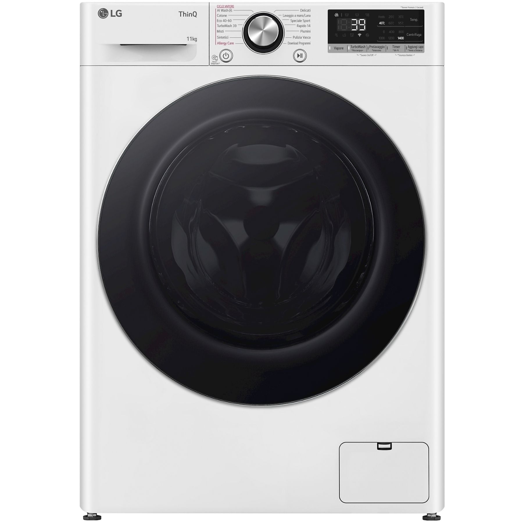 Cotone, Delicati/Seta, Eco 40-60°C, Igiene/Allergy Care, Mix, Prelavaggio, Rapido 14min, Risciacquo & centrifuga, Sport, Vapore |